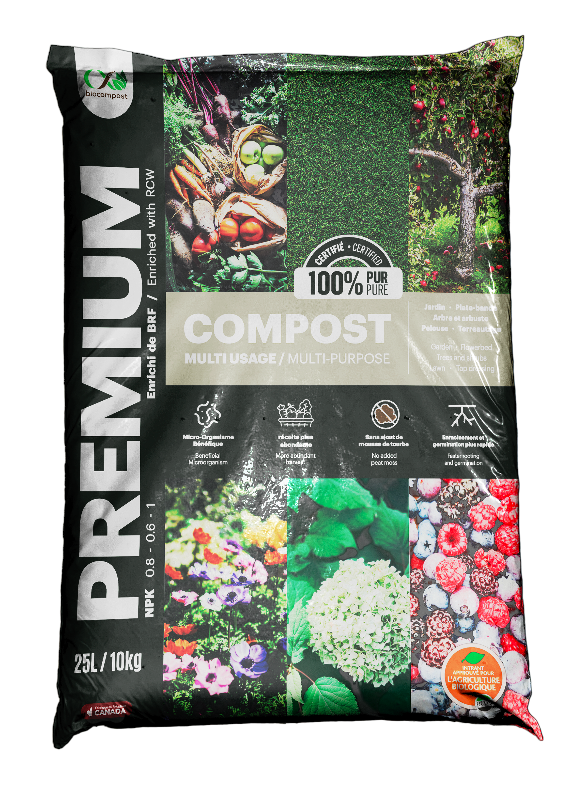 Dans un mélange de terre, la tourbe sert surtout à alléger et donner du volume. Elle apporte peu de nutriments et très peu de vie au sol. Chez Biocompost, nous avons fait un autre choix.